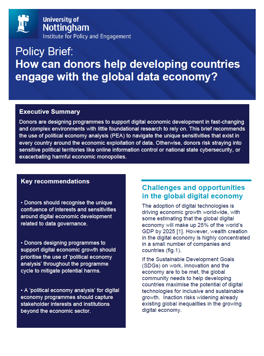 This policy brief recommends the use of 'political economy analysis' to navigate the unique sensitivities that exist in every country around the economic exploitation of data.